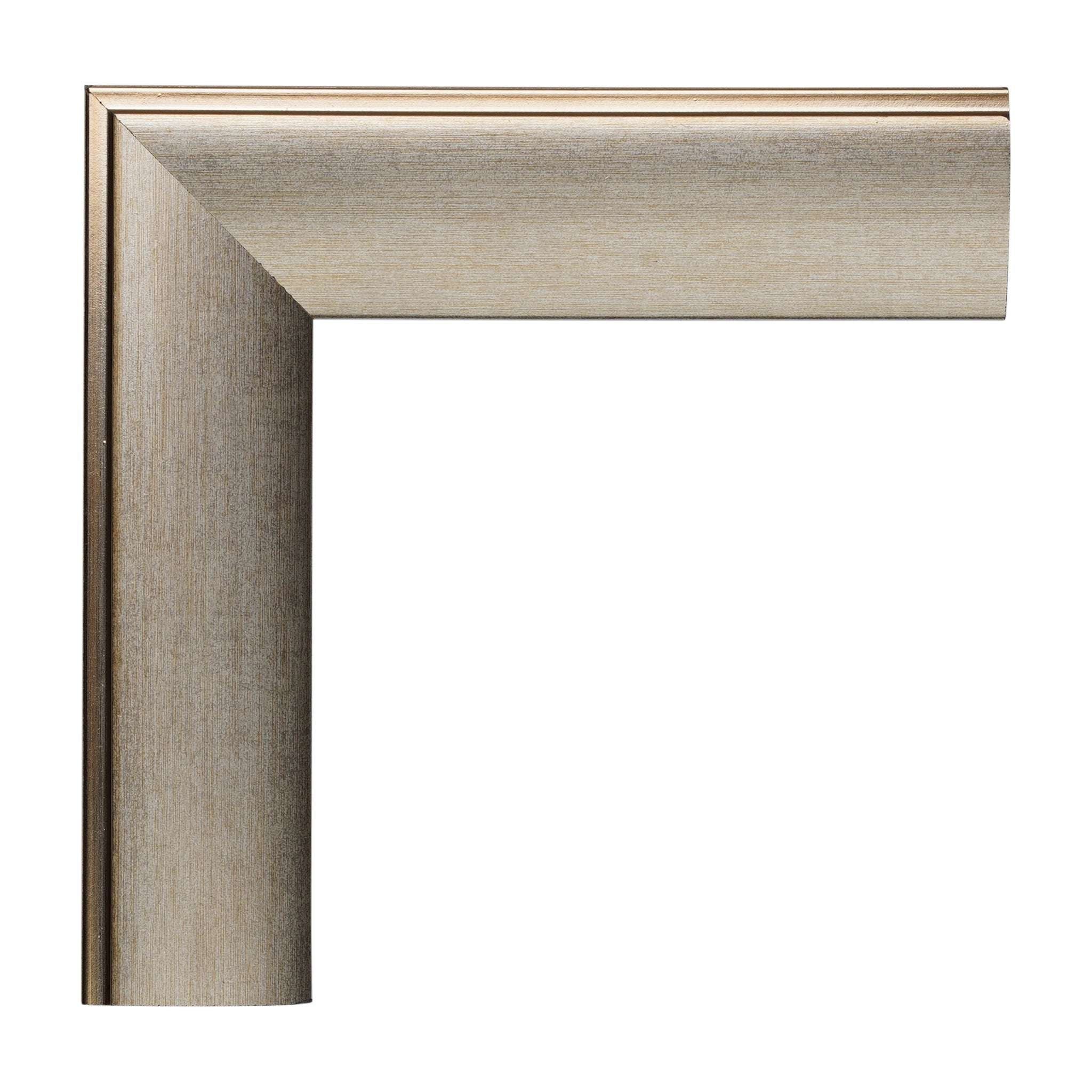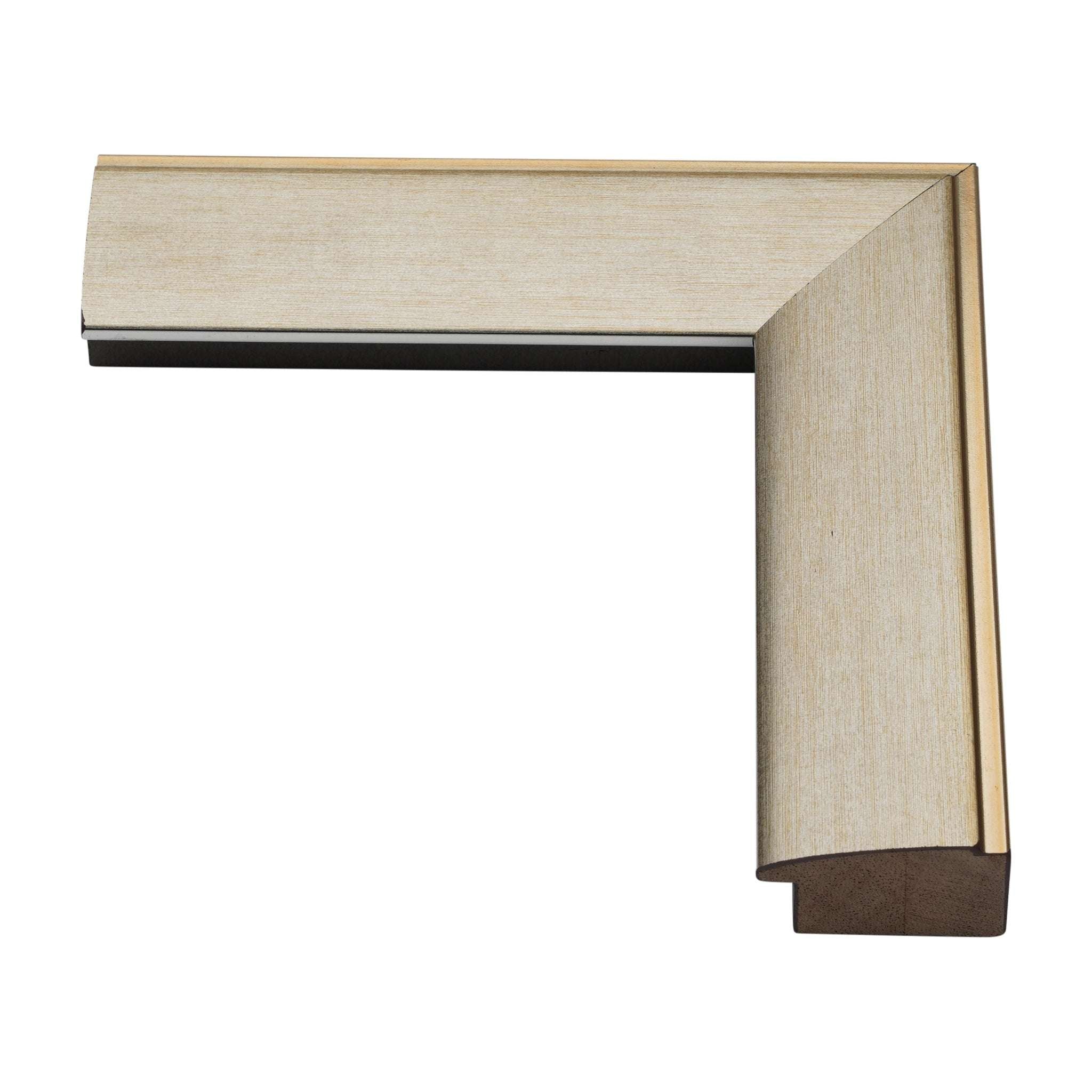 Swathed with a metallic gold champagne finish, this 1 1/2” custom placer frame with an inverted face, straight flange and 1/2” rabbet depth is a posh pick for framing art or portraits.