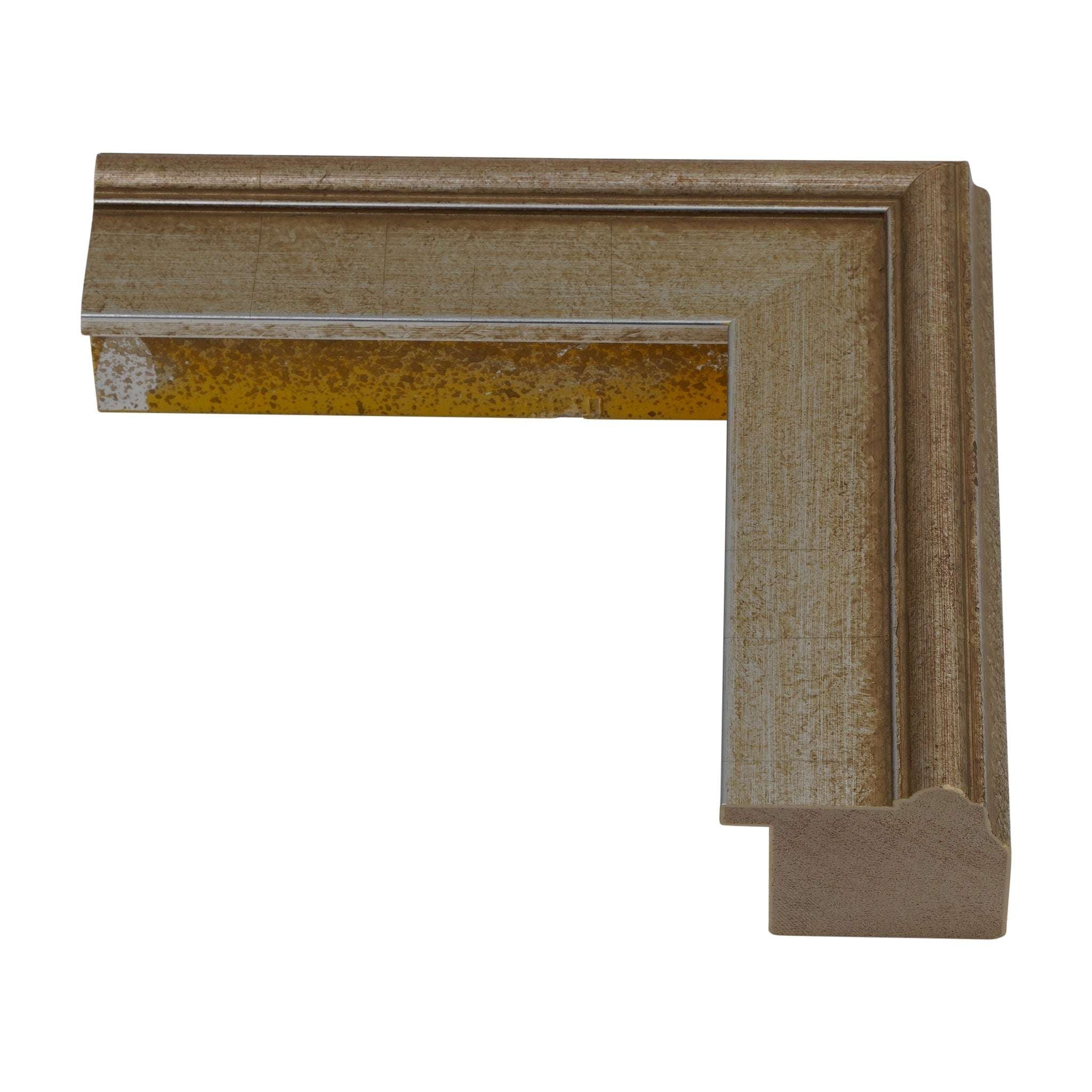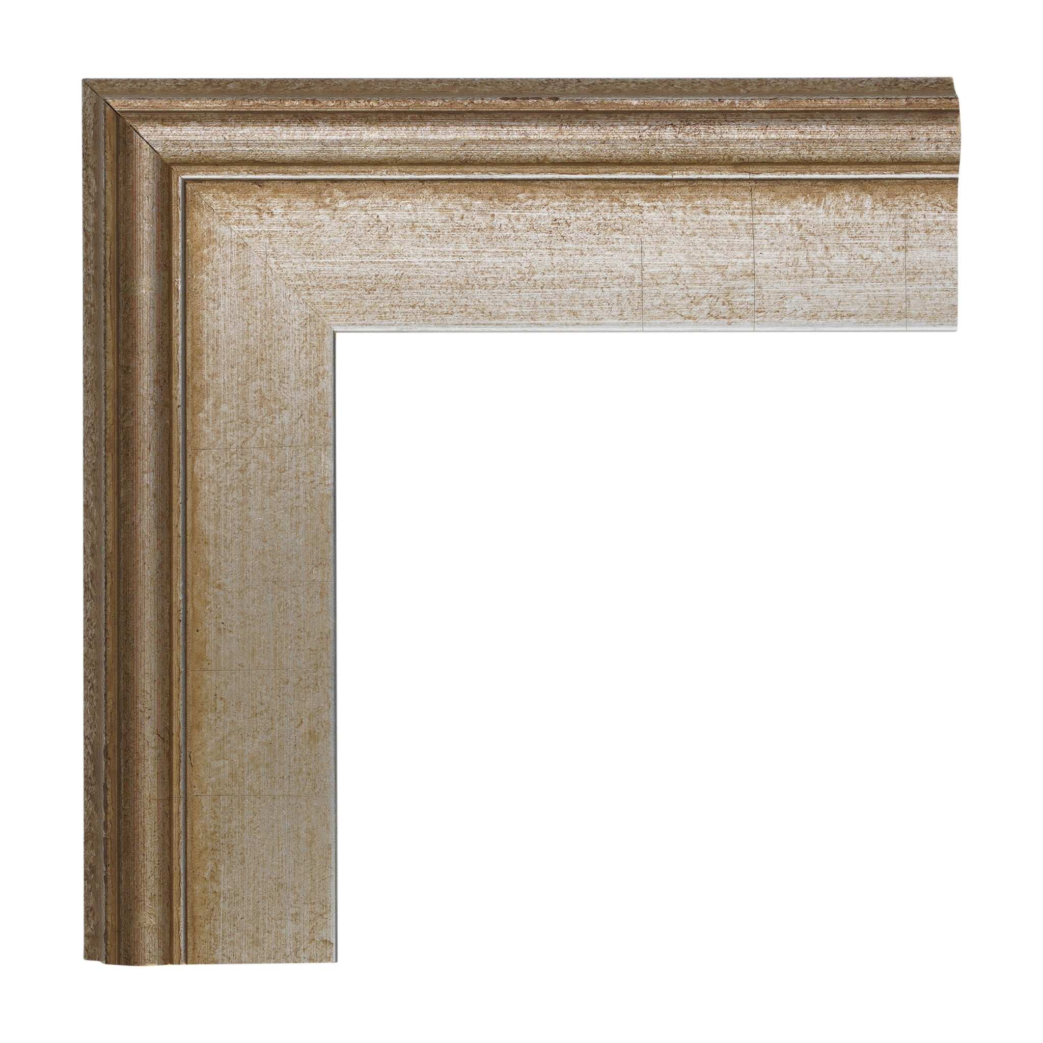 Tinted with a soft antique silver champagne finish, trimmed up with a beveled edge and appointed a 1” rabbet depth, this 1 3/4” custom frame moulding sheds romantic traces of vintage charm. **Please note this frame has distress marks periodically on the edges which is by design. Please reference photos to confirm this is to your liking.