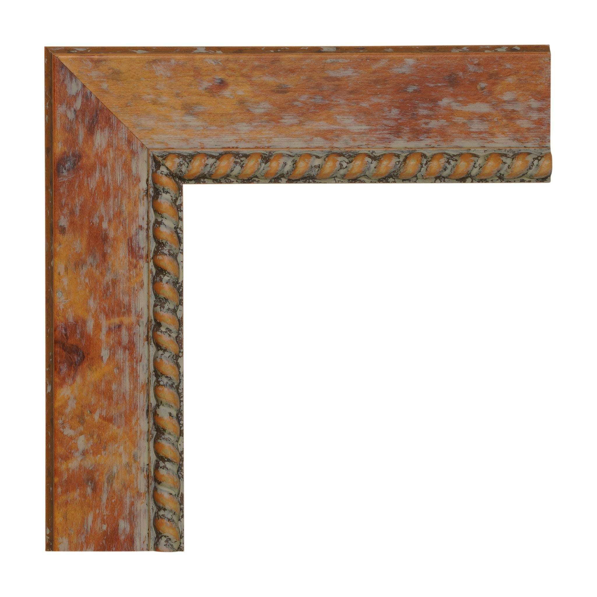 Highlighted by a 1 5/8" width and 3/8" rabbet depth, this custom light brown frame flaunts beaded trim and a distressed antique finish for a rustic Renaissance look.