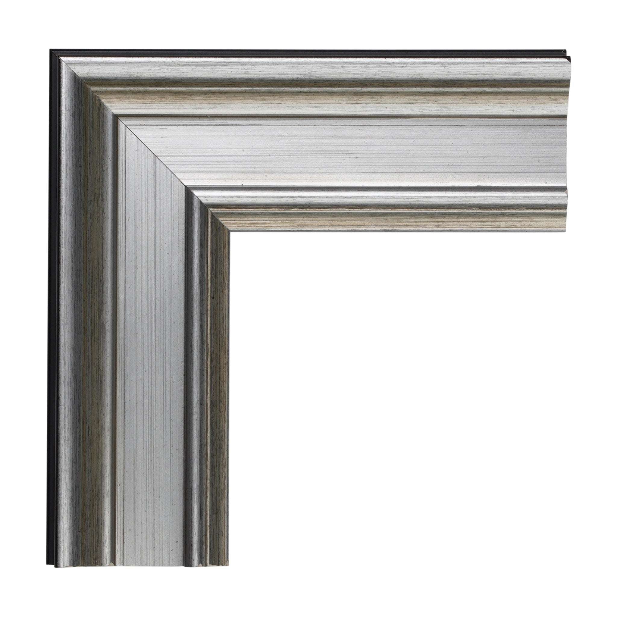 A solid black border edges the outer rim of this 2 1/8” plein air silver frame with a 7/16” rabbet depth to bring out its silvery beauty. A very similar option is available in gold #1101.